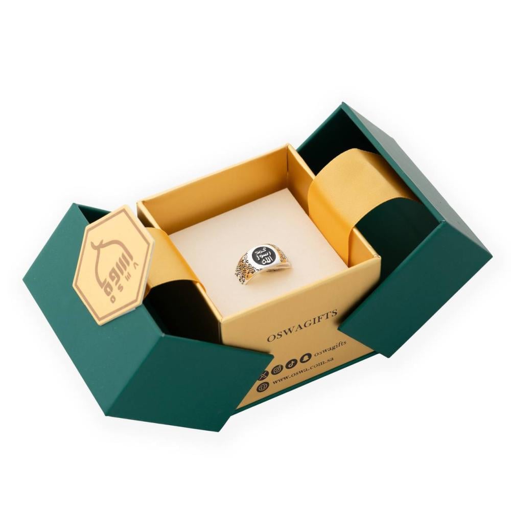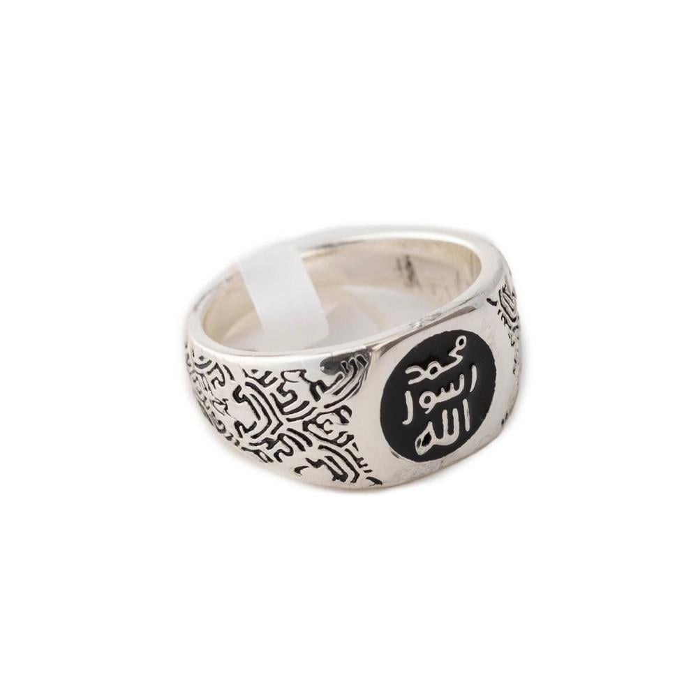 خاتم النبي ﷺ، بتصميمه وألوانه التي تليق بأناقة الرجال، وله قيمة وفخامة لأنه يحاكي خاتم الرسول ﷺ، ومصنوعٌ مِن المَعدِن المُقاوم للصدأ المَطليِّ بالفضة، يُجمِّلُه نقشٌ رائعٌ لعبارةِ (محمدٌ رسولُ الله).