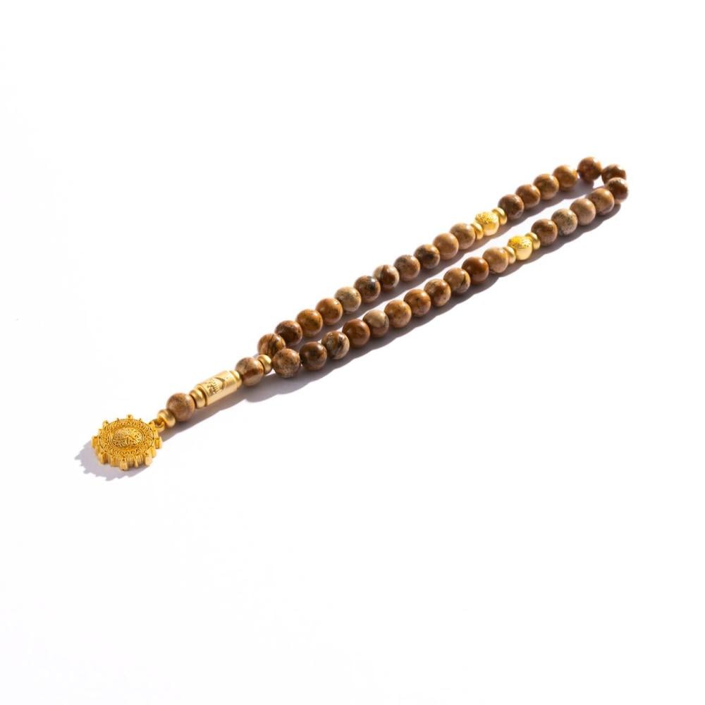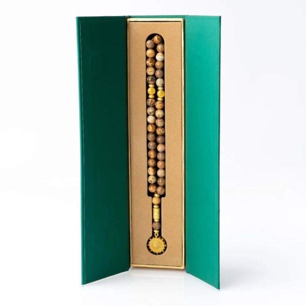 33 حبة من الحجر الطبيعي مموج فريد تتآلف لتكوِّن سبحة ختم باب المسجد النبوي الفاخرة، ويرقى بقيمتها تصميم يعكس روح الحضارة الإسلامية والمدينة النبوية، ومضمومة بخيط مقاوم وثابت يضمن المتانة والإحكام.