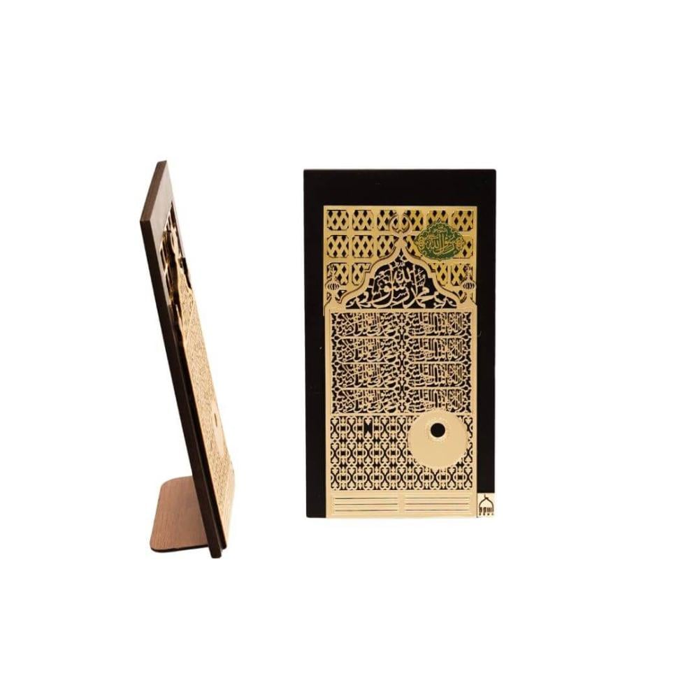 لوحة مكتبية مواجهة السلام على الرسول ﷺ مصنوعة من الخشب الطبيعي ومصممة لتضفي على ثراء راقيا مستمدا من روعة العمارة الإسلامية في الحرم النبوي الشريف.